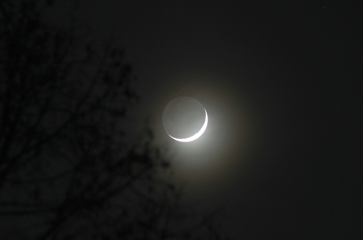 Das Dämmerungsblau ist verschwunden, der Erdschein gut zu sehen. Hochfliegende Wolken schieben sich davor