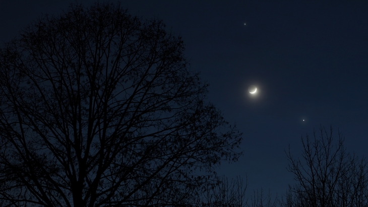 Jupiter, Venus und der Mond mit deutlichem Erdschein (22.2.2023)