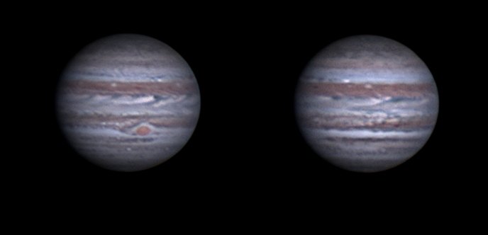 I've looked at clouds from both sides now: "Vorne" der Große Rote Fleck des Jupiter, "hinten" die Störung im südlichen Äquatorialband (4. u. 5.2.2025, LX90, Asi 678MC)