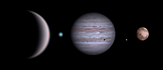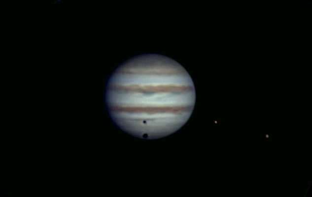 Jupiter mit den Monden Europa und Ganymed (der größere der beiden) und deren gleichzeitigem Schattenwurf auf den Planeten (30.12.2023)