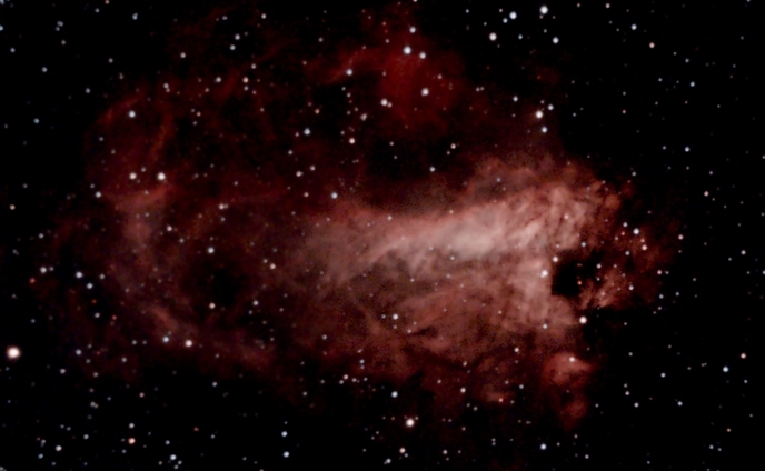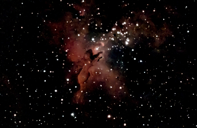Der Adlernebel, ein Emissionsnebel (IC 4703) samt offenem Sternhaufen (M16) im Sternbild Schlange. Das schlechte SNR erforderte unangenehm starkes Entrauschen (Daten)