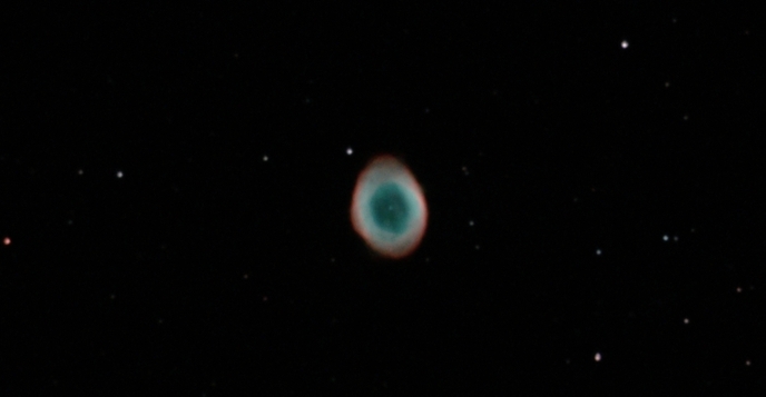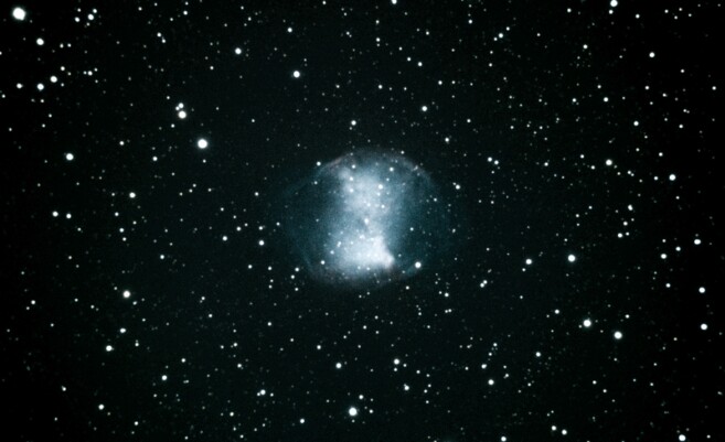 M27, der Hantelnebel im Sternbild Fuchs. Kombination von 1171 Belichtungen aus 6 Nächten mit zumeist 10s und ISO 1600. PC-Rechenzeit: mehr als 10 Stunden