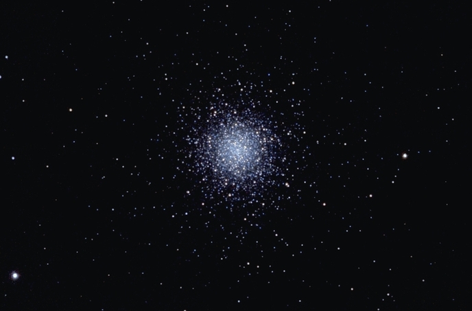 Der berühmte Kugelsternhaufen M13 im Herkules: 500.000 Sterne in 25.000 Lichtjahren Erdabstand. Eingefangen mit einem 500 mm / 5.6 Maksutov-Objektiv
