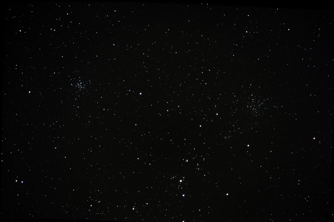 Die beiden offenen Sternhaufen M36 (links) und M38 (rechts), beide im Fuhrmann. Die Brennweite betrug hier nur 300 mm, das Teleobjektiv war huckepack am Teleskop montiert