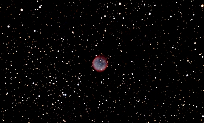 Der NGC 6781 ("Schneekugelnebel"), ein Planetarischer Nebel im Adler, hier mit dem Rot des angeregten Wasserstoffs. Verantwortlich: Der ultraheiße Zentralstern (110.000° C) (Daten)