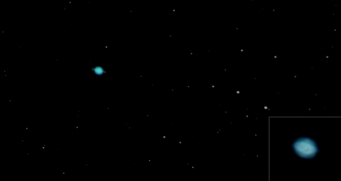 Der auch als Saturnnebel bekannte NGC 7009, ein Planetarischer Nebel - entdeckt1782 von William Herschel im Wassermann. Rechts unten eingeblendet mit 3facher Drizzle-Vergrößerung.