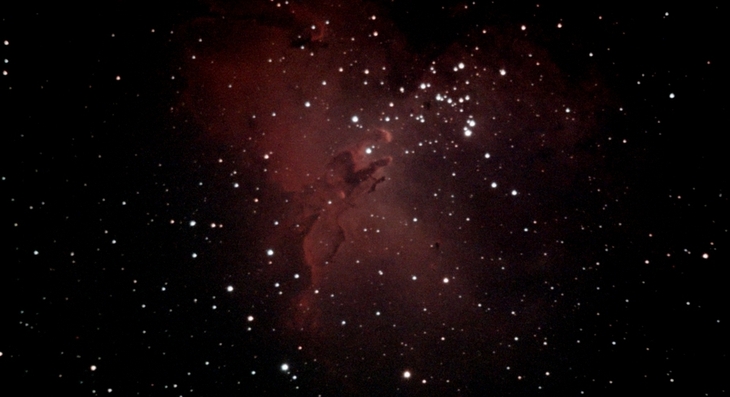 Der Adlernebel, ein Emissionsnebel (IC 4703) samt offenem Sternhaufen (M16) im Sternbild Schlange. Das schlechte SNR erforderte unangenehm starkes Entrauschen (Daten)