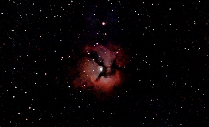 M20, der Trifidnebel im Schützen (trifidus, lat.: „dreigeteilt"). Eine Dunkelwolke aus Staub teilt ihn scheinbar in drei Teile. Jedoch: Wo ist seine Farbe hin?