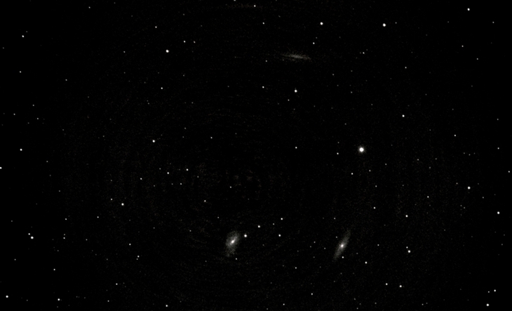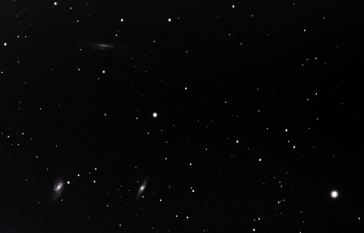 Die Galaxien M66 (links), M65 (rechts) und NGC 3628 (oben). Brennweite: 500 mm