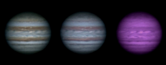 Jupiter am 16.12.2024: Links im visuellen Bereich, i.d. Mitte visuell + IR, rechts nur im IR