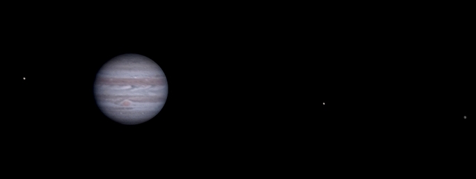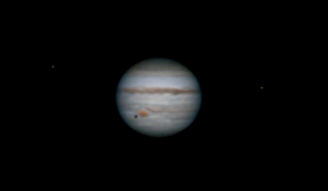 Am 2.10.2022 zog Jupitermond Europa (hier ist bloß der Schatten sicher erkennbar) vorm Großen Roten Fleck vorbei. Leider sehr schlechtes Seeing. Links Ganymed, rechts Io.