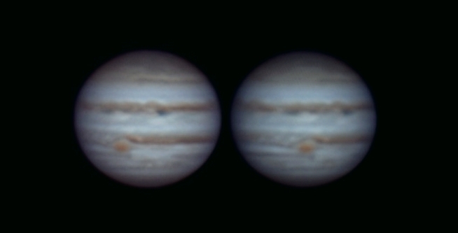 I've looked at clouds from both sides now: "Vorne" der Große Rote Fleck, "hinten" die Störung im südlichen Äquatorialband (4. u. 5.2.2025, LX90, Asi 678MC)