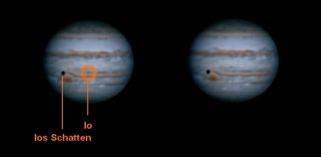 Die Io (rechts) ist der innerste der großen Jupitermonde. Auf der Planetenkugel sieht man ihren Schatten. |