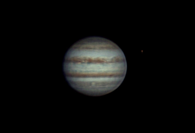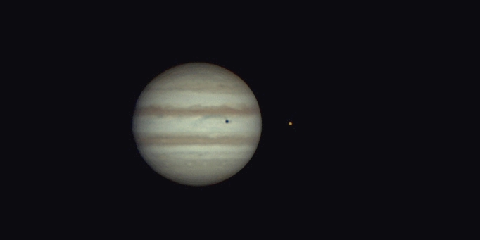 Jupiter am 28.4.2016. Der Mond Ganymed (rechts, mit Detail!) wirft seinen Schatten auf den Planeten.