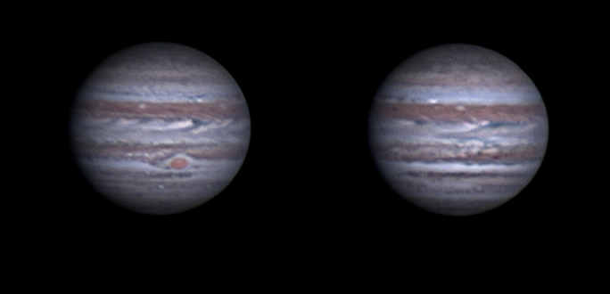 Jupiter mit hübschem blauen Fleck im nördlichen Äquatorialband. Rechts: 40 Minuten später folgen zwei weitere. Unten: Der Große Rote Fleck (18.11.2023)
