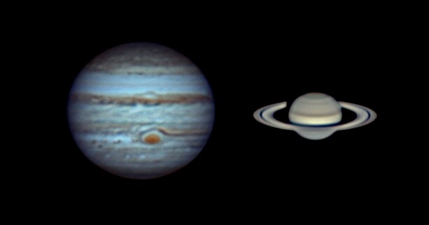 Jupiter und Saturn am 4.10.2022, zusammengestellt im gleichen Maßstab. Im Vergleich mit der Aufnahme unten erkennt man, wie wichtig gutes Seeing (geringe Luftunruhe) ist!