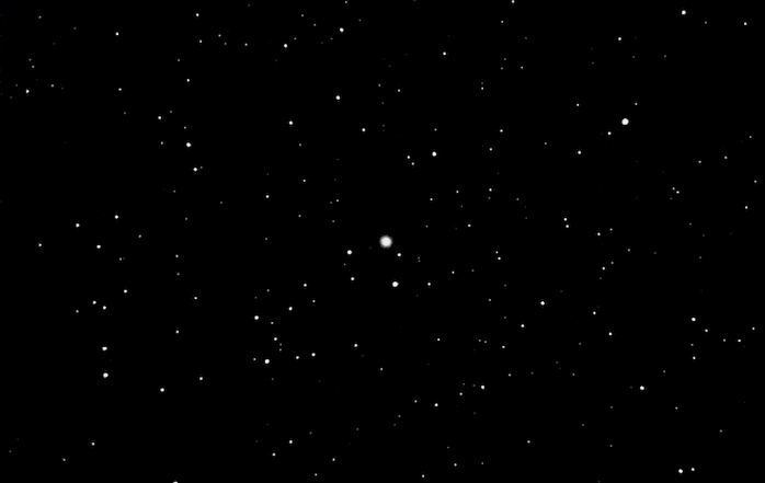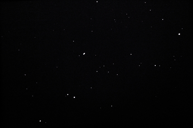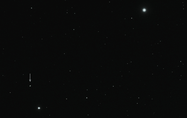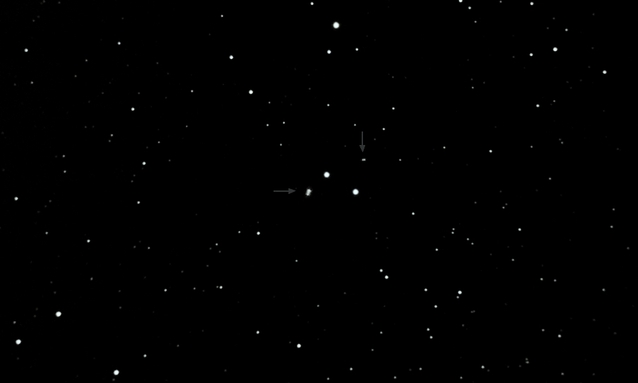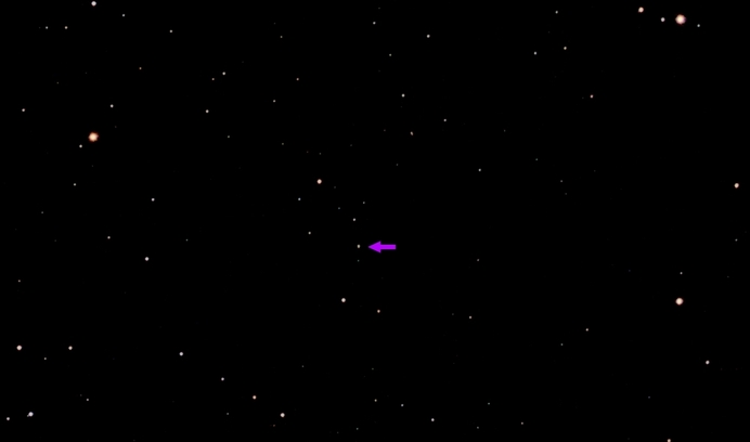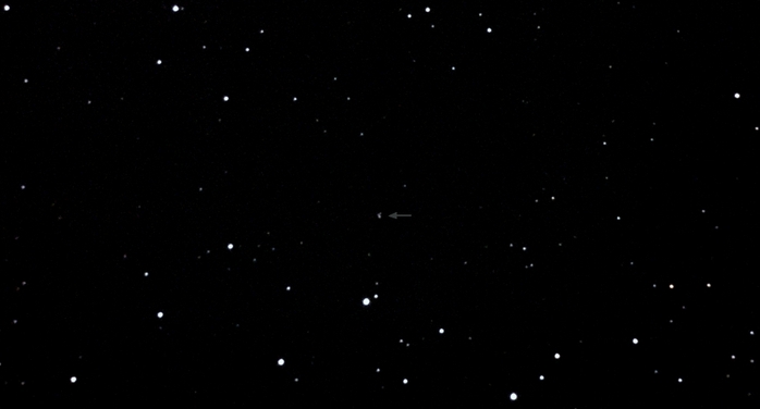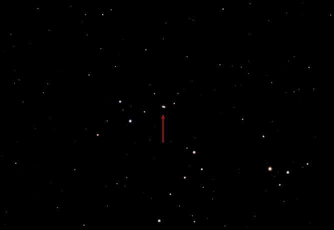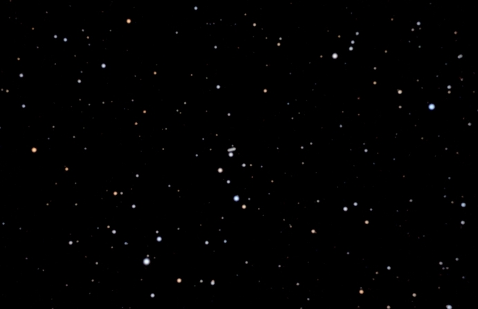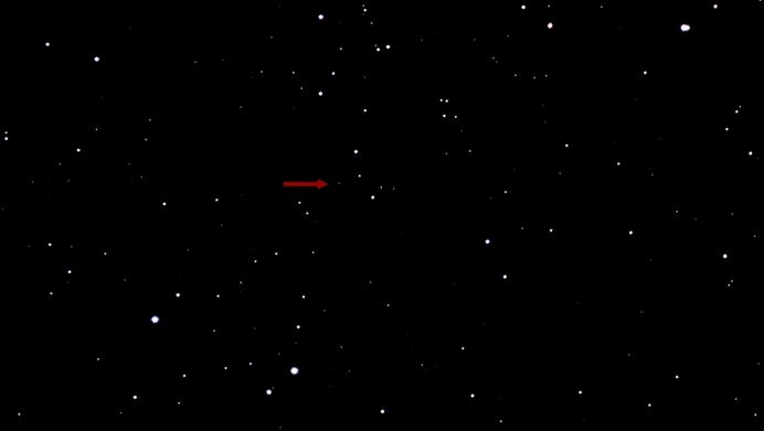 Der Kleinplanet Christine, 1907 entdeckt, 51 km groß und hier in 345 Mio. Erddistanz, verrät sich durch seine Bewegung (Bildmitte)
