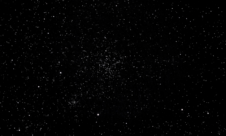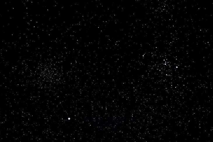Die beiden offenen Sternhaufen M36 (links) und M38 (rechts), beide im Fuhrmann. Die Brennweite betrug hier nur 300 mm, das Teleobjektiv war huckepack am Teleskop montiert