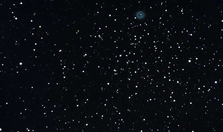 Der offene Sternhaufen M46 in Puppis (Hinterdeck des Schiffs). Der planetarische Nebel NGC 2438 steht in halber Erddistanz. Er gehört somit nicht zum Haufen