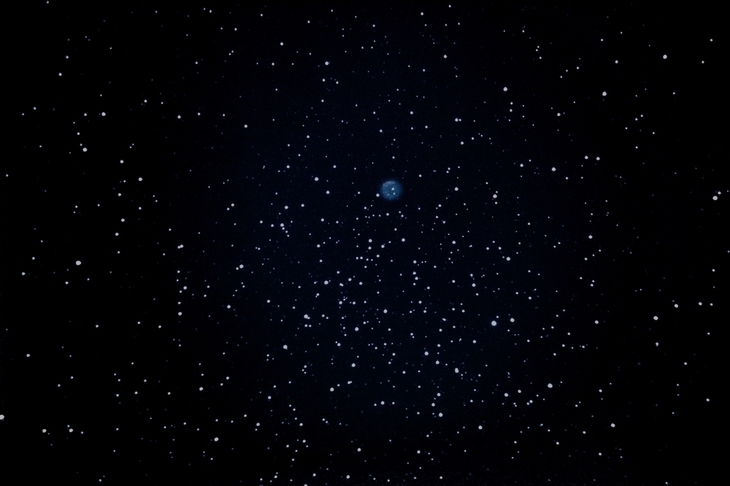 Der Offene Sternhaufen M46 im Sternbild Achterdeck (Puppis), ebenfalls bei Mondlicht. Darin der Planetarische Nebel NGC 2438